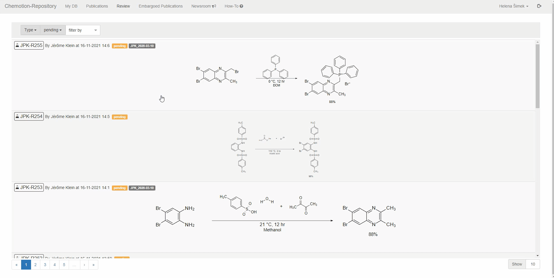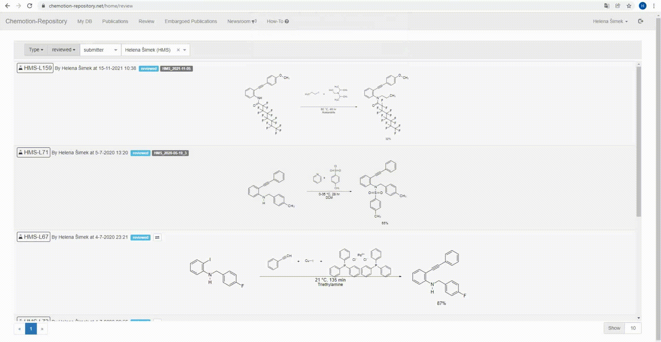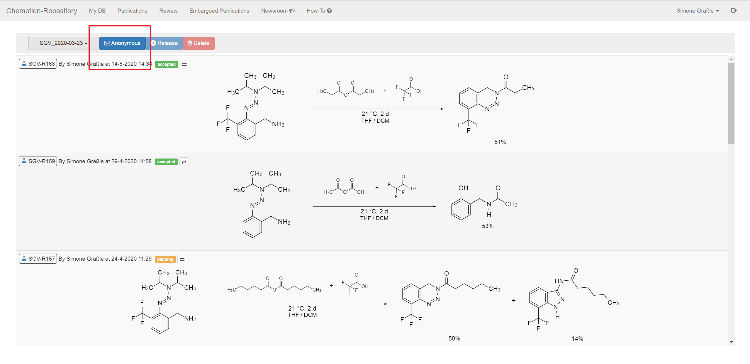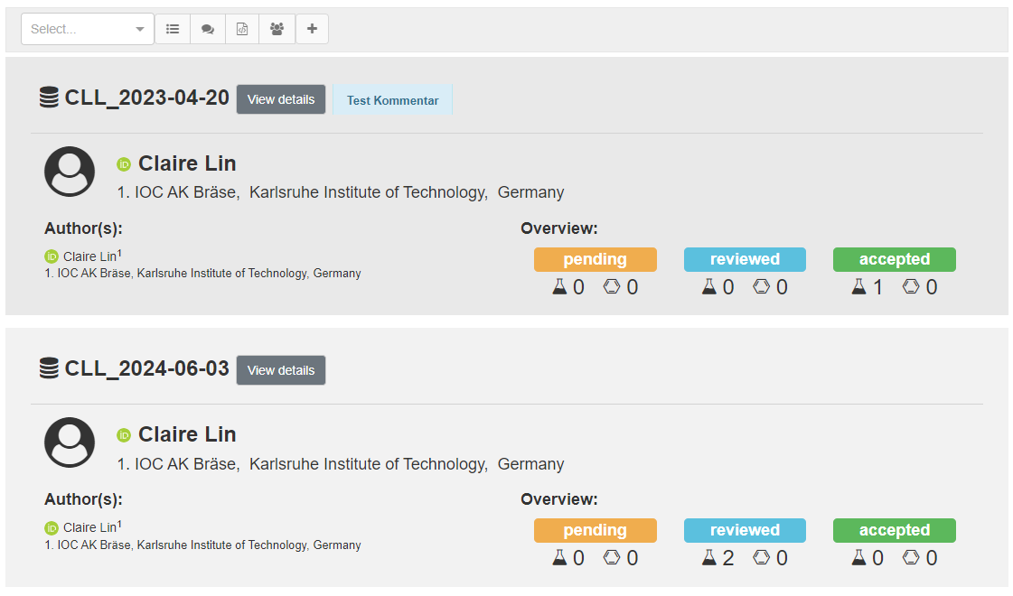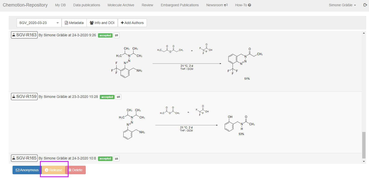 To release an embargo, all data that are part of the embargo bundle have to be reviewed successfully by the Chemotion repository team (all set to accepted -> green). If you want to release only a part of a formerly generated embargo, you have to move open submissions with status "pending" or "reviewed" to another embargo bundle (see description below).