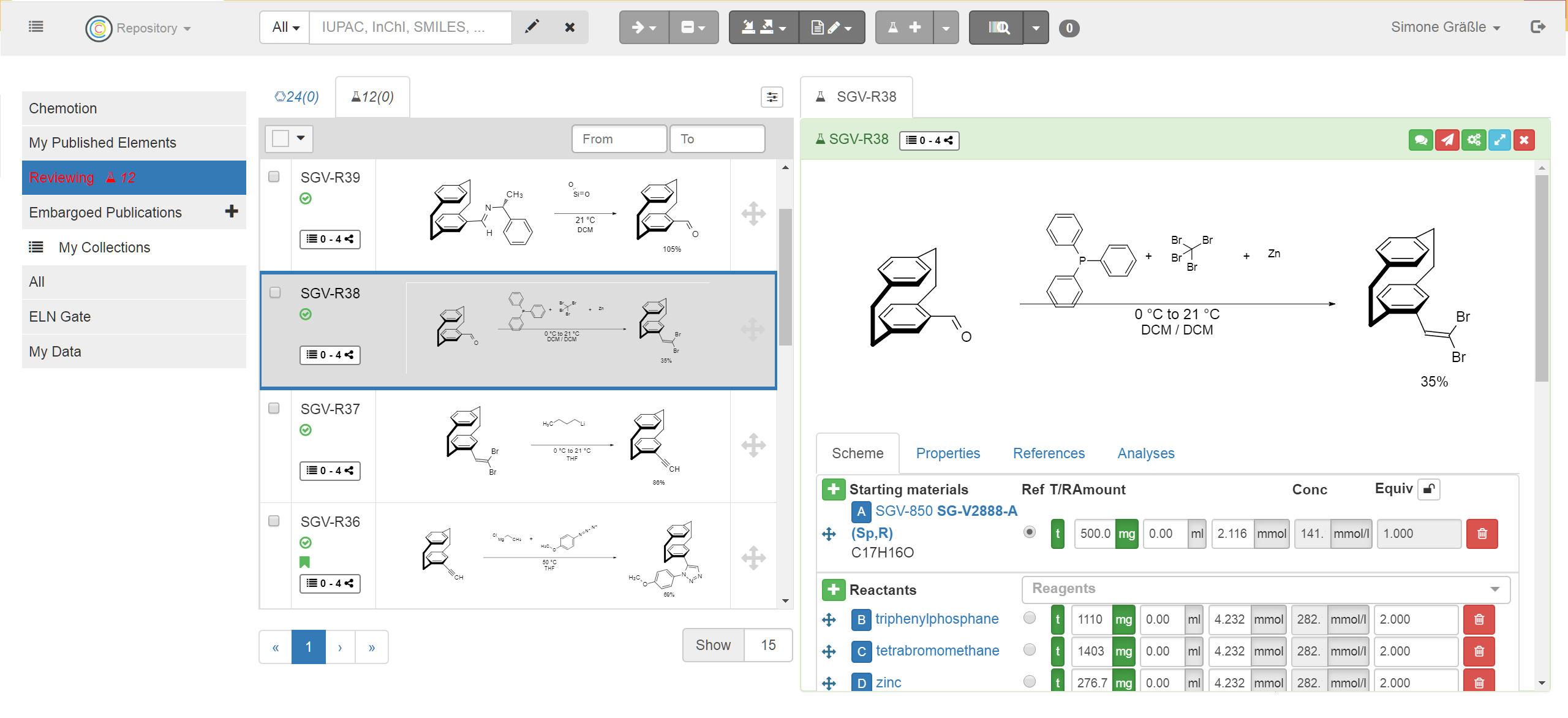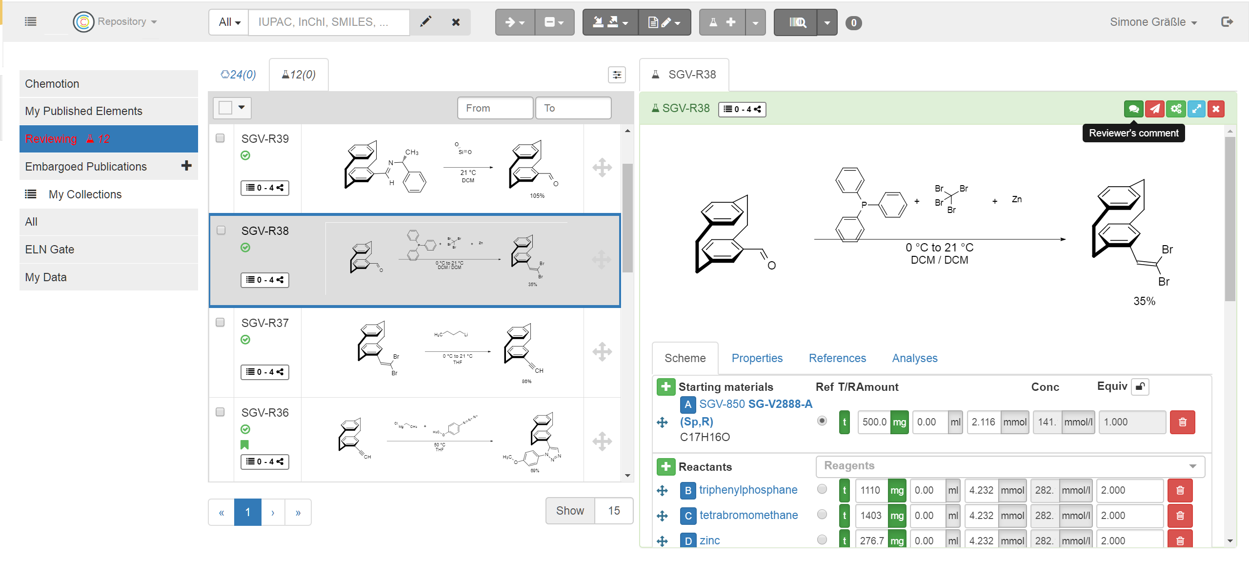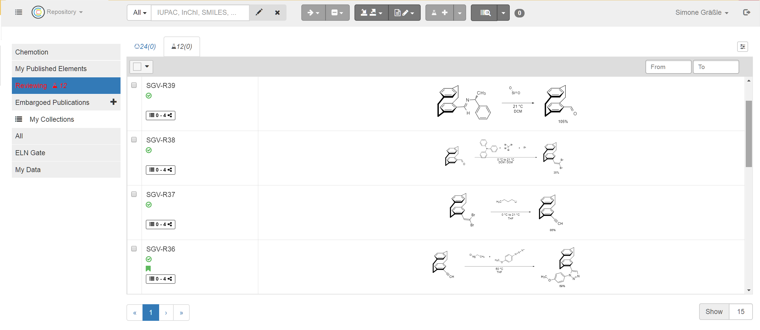 Your data is checked for formal issues (formatting, purity of the compounds and quality of the spectra) and for plausibility. The plausibility check is supported by automated procedures. After the Chemotion team checked your data, you will receive a reviewing protocol including the necessary changes if there are any. You will receive a notification in the repository UI and an email will be sent to your contact email address. Please open the given links or open the reviewing protocol in the repository “My DB” area, collection: “reviewing”.