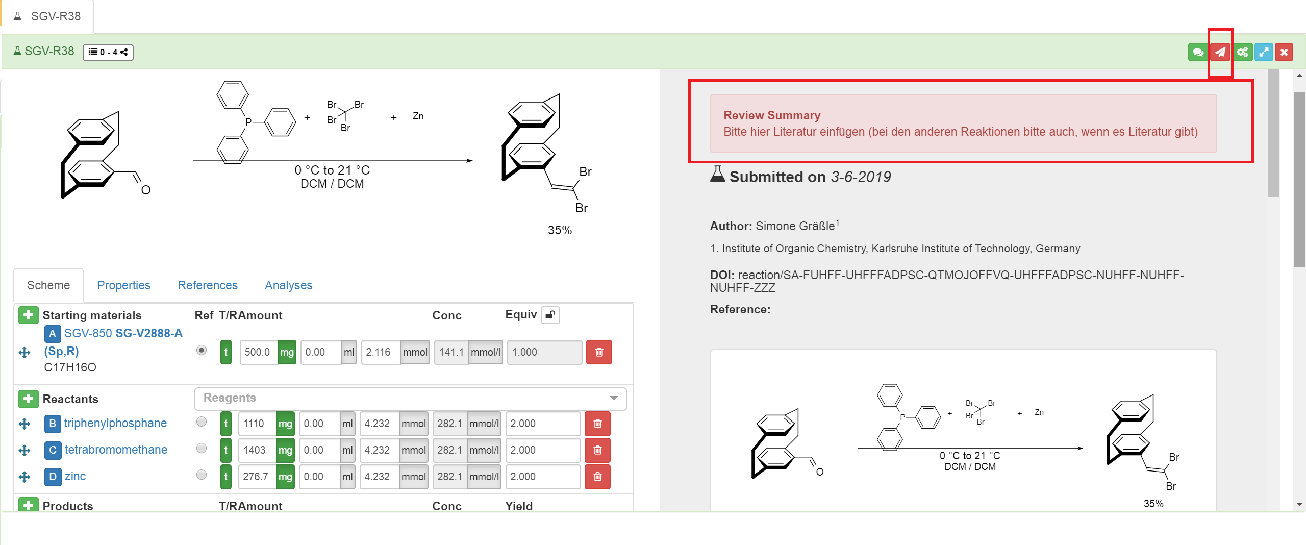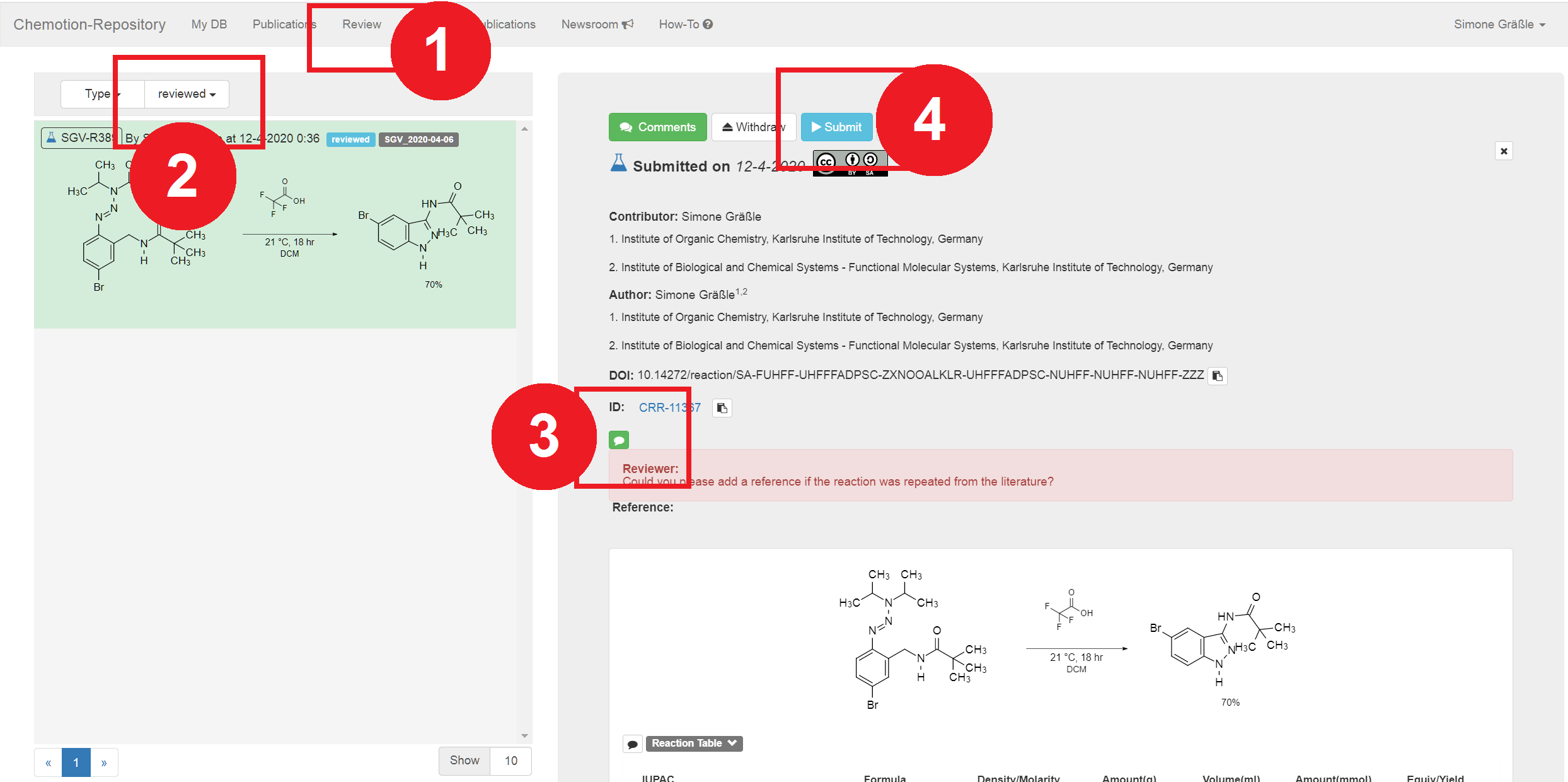 If all changes are complete and you commented on the referees comments, please select the button submit (4) to send your changes and comments to the referees. In case everything is corrected, the submission proceeds to the publication (or will be set on hold for embargoed submissions). If you need another revision, the Chemotion team will let you know by notification and email.